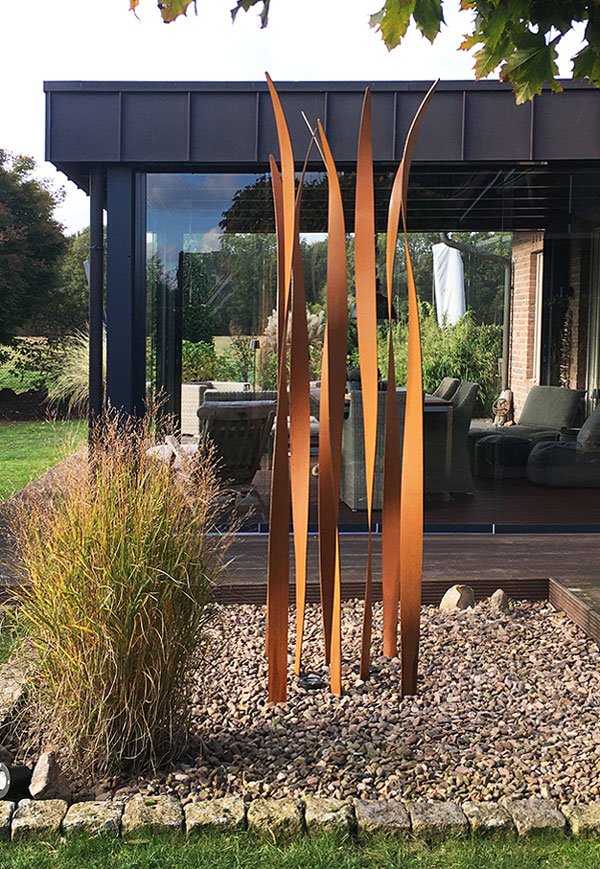 Große Gräser sind reizvolle Pflanzen im Garten. Unser Schilfobjekt ist die skulpturale Umsetzung. Der schwere Stahl bewegt sich im Wind wie das Gras in der Natur. Die rotbraune Stahlpatina bildet einen harmonischen Kontrast zum Grün des Gartens. Einen magischen Moment können Sie beim Einsetzen der Dunkelheit erleben. Dann verwandeln sich die Blätter durch die integrierte Beleuchtung in ein Flammenmeer. Die Skulptur wird in Modulen gefertigt. Die Grundplatte, auf der die einzelnen Blätter befestigt sind, verschwindet im Boden. So entsteht der Eindruck, als würden die Blätter aus dem Boden wachsen.